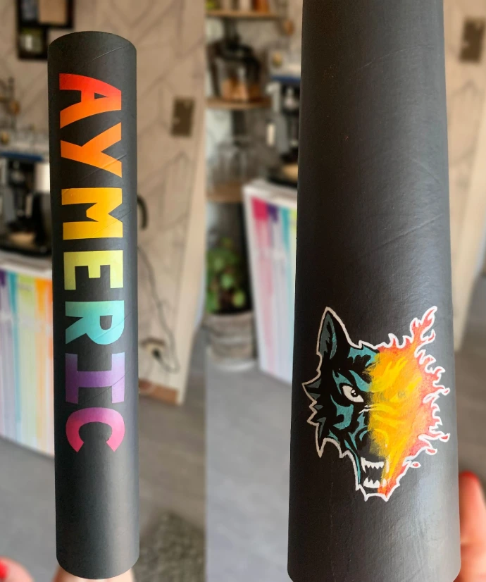 Chaque boîte est entièrement peinte à la main avec soin, garantissant une personnalisation unique et un rendu de qualité. J’utilise des peintures adaptées pour assurer une bonne tenue dans le temps, même en cas de transport fréquent grâce à un film plastique installé pour protéger le tube. Chaque détail est travaillé avec précision pour que votre boîte reflète parfaitement votre identité, celle de votre club ou de votre équipe d’interclubs.
